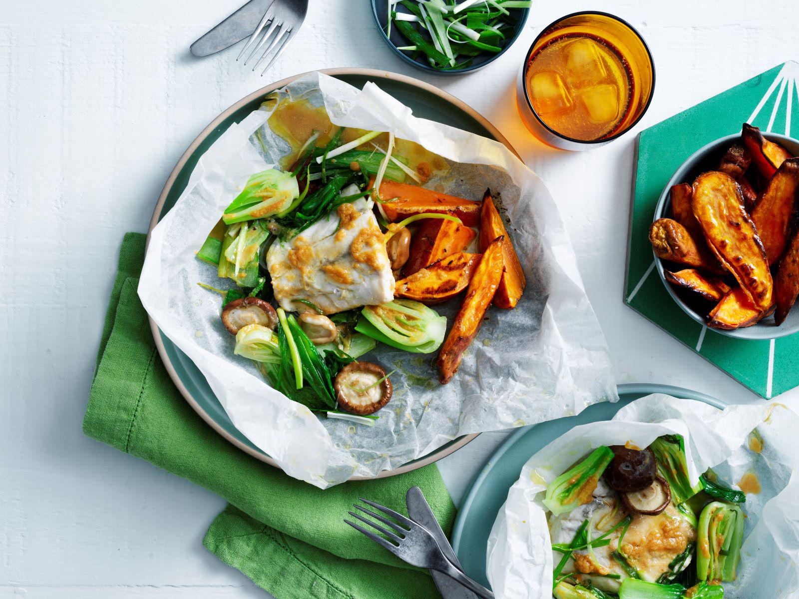 Paper Bag Steamed Miso Butter Fish With Sweet Potato Wedges